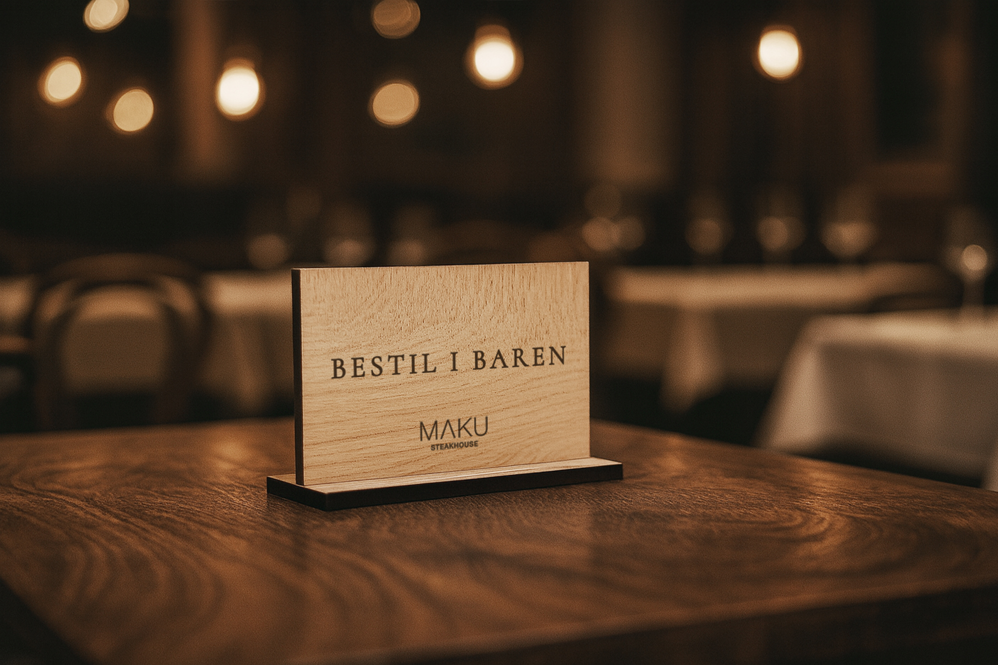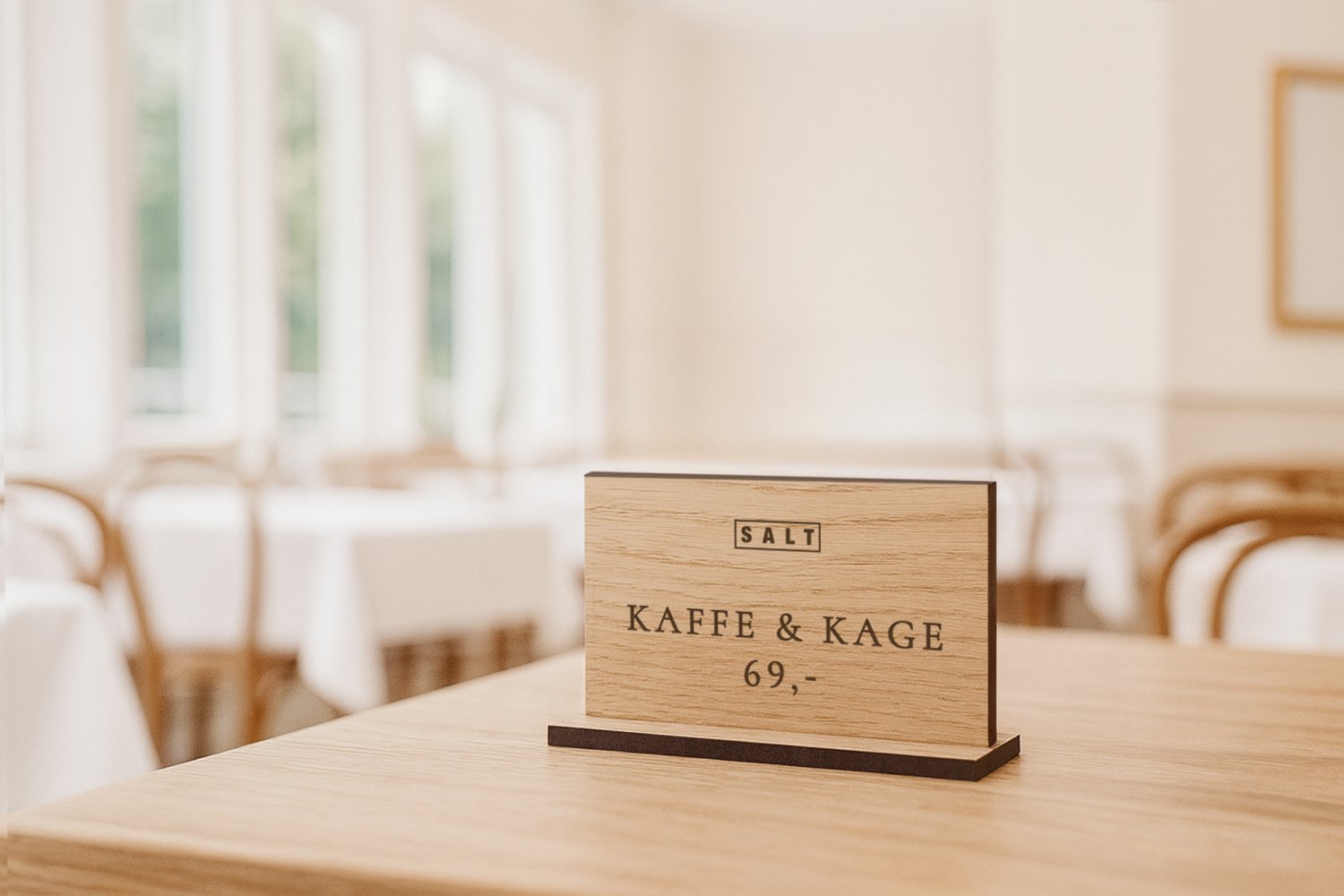 Små infoskilte i træ, skræddersyet med din egen tekst, perfekte til hoteller, restauranter og virksomheder. En stilfuld og naturlig løsning til diskret og elegant informationsformidling.