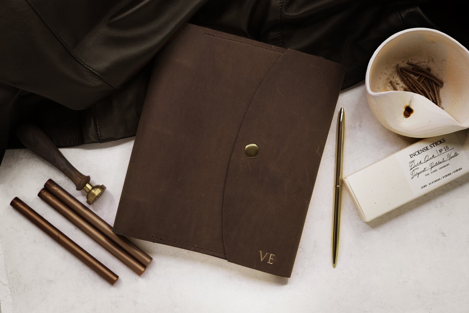 Håndlavet A5 notesbog af ægte tykt okselæder af højeste kvalitet, efterbehandlet med naturlig bivoks for et rustikt og slidstærk finish. Bogen indeholder en notesblok på 130 sider, som kan udskiftes, to mindre lommer til f.eks. visitkort, en stor lomme til noter og foto samt en lomme til kuglepen.