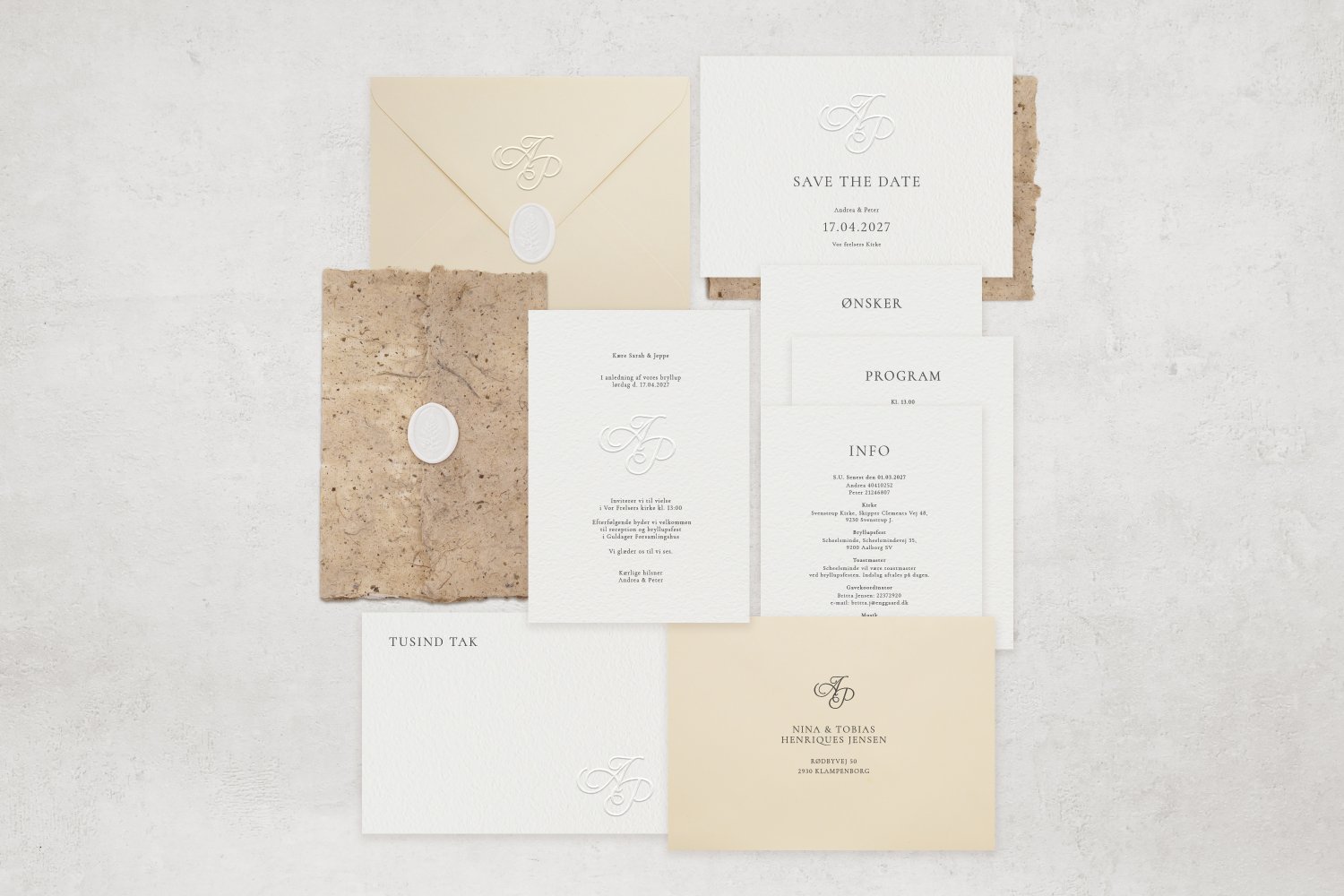 Vores letterpress tryksager måler som standard ca. 12,5x17,5cm, vælges lommeomslag, vil tillægark være mindre. Letterpress monogram præges på invitation (og kuvert, hvis det bestilles).
