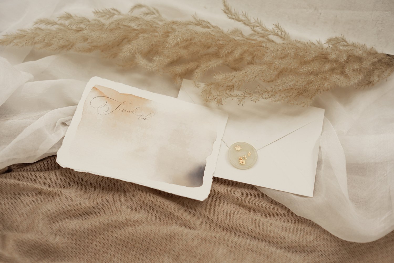 Tak gæsterne for deres deltagelse ved jeres store dag med håndlavede takkekort. På kortene er der trykt "Tusind tak", med plads nede under til at der kan skrives en personlig tekst i hånden til hver gæst. Ønskes en fortrykt tekst, ens på alle ark, sendes teksten i en email. Foto viser for- og bagside.