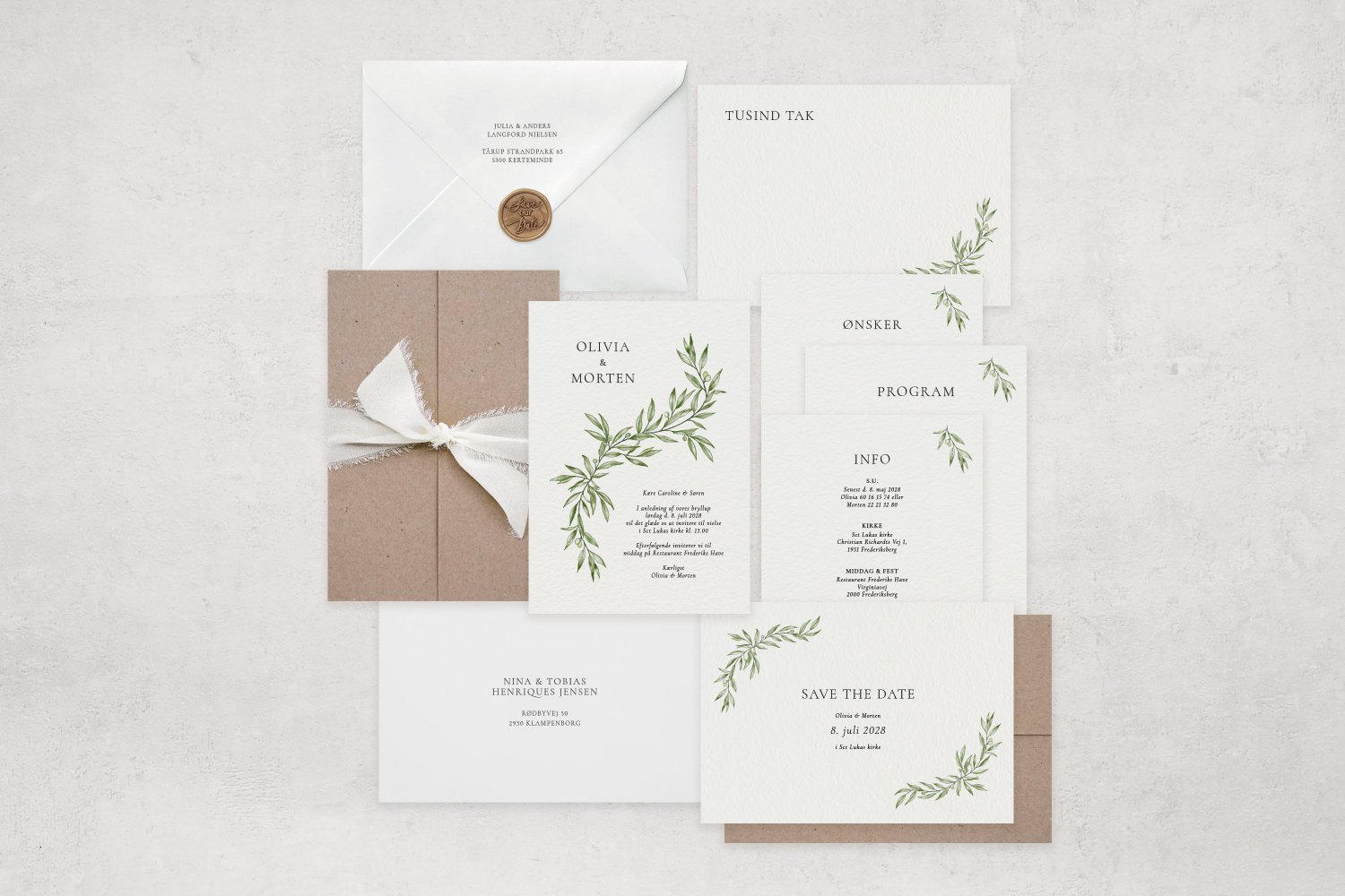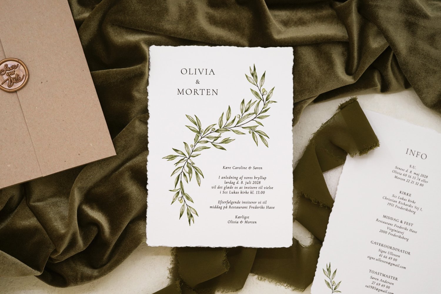 Olive bryllupsinvitationer med akvarelmalede olivengrene, der giver et naturligt udtryk. Et elegant valg til brudeparret, der ønsker en stilren invitation med et tidløst botanisk motiv. Valgfrit tilbehør, herunder bl.a. kvalitetskarton, det populære vellum omslag, blødt invitationsbånd og konvolutter med adressetryk.