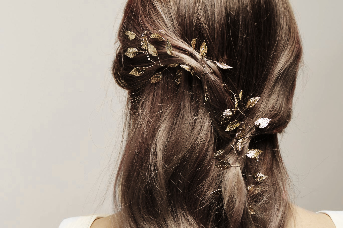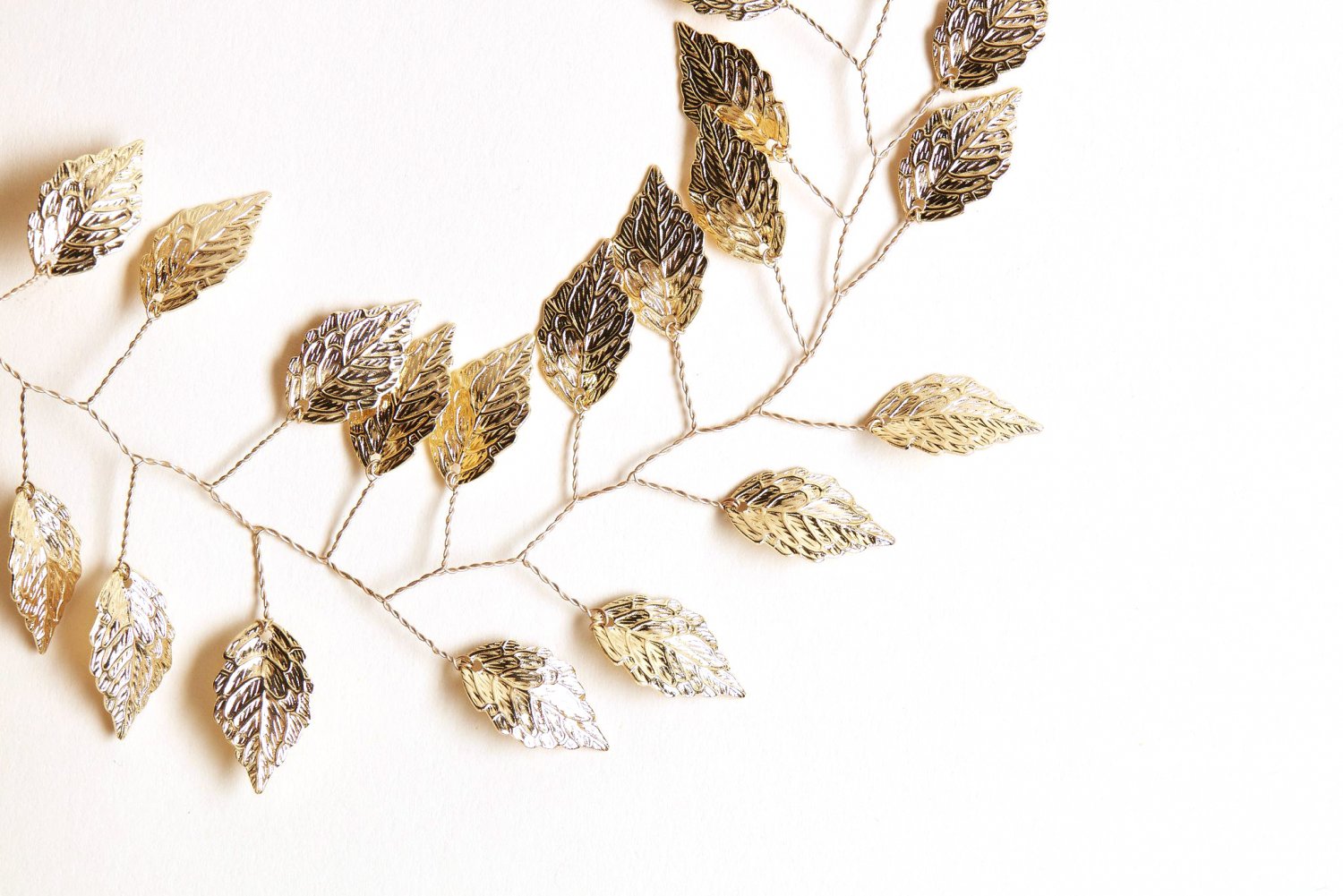 Gylden headpiece fra Paris af håndsnoede metaltråde, dekoreret med gyldne blade, som kan justeres efter form efter ønske. Rigtig fin til både løst og opsat hår. Sættes i med hårnåle som medfølger.