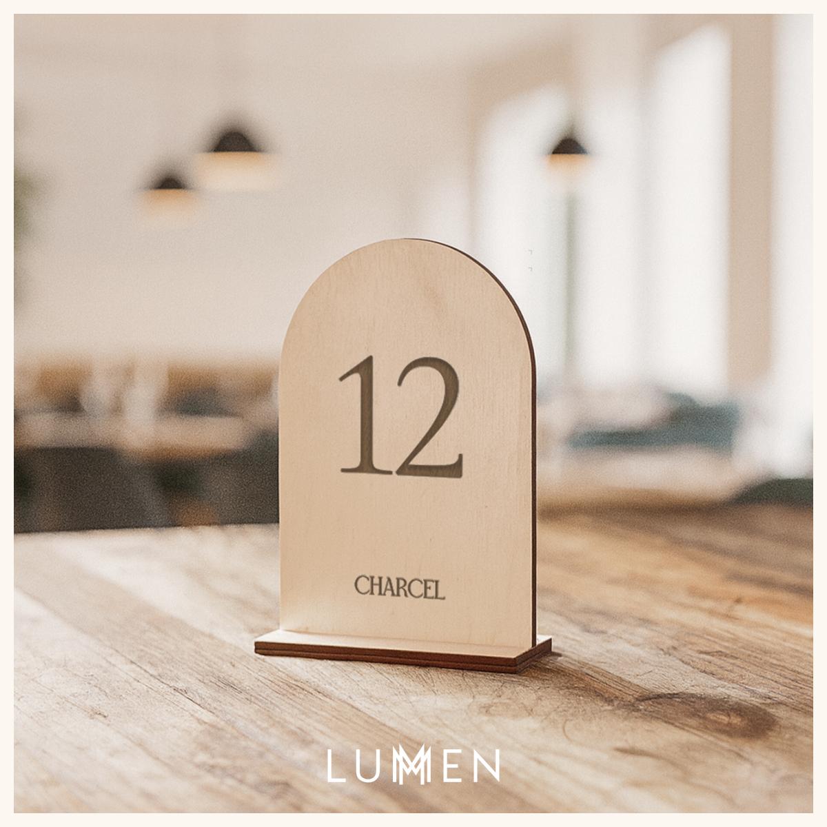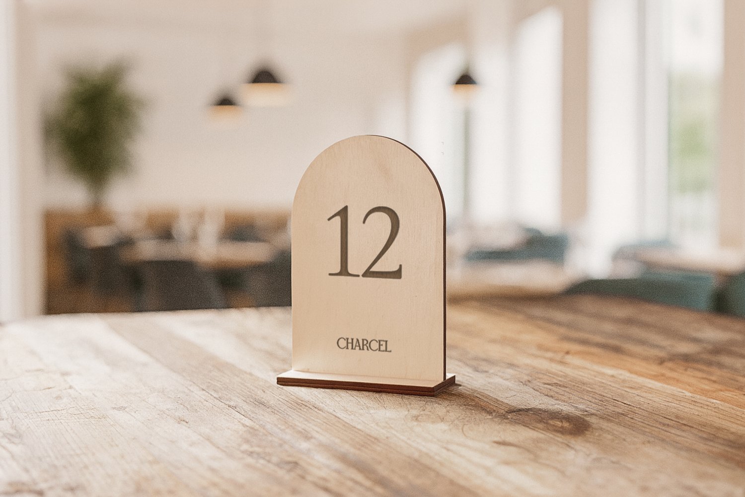 Elegante bordnumre i valgfri træsort med buet form og præcis gravering af nummer og evt. logo – perfekt til restauranter, caféer og hoteller, der ønsker et naturligt og stilrent udtryk.