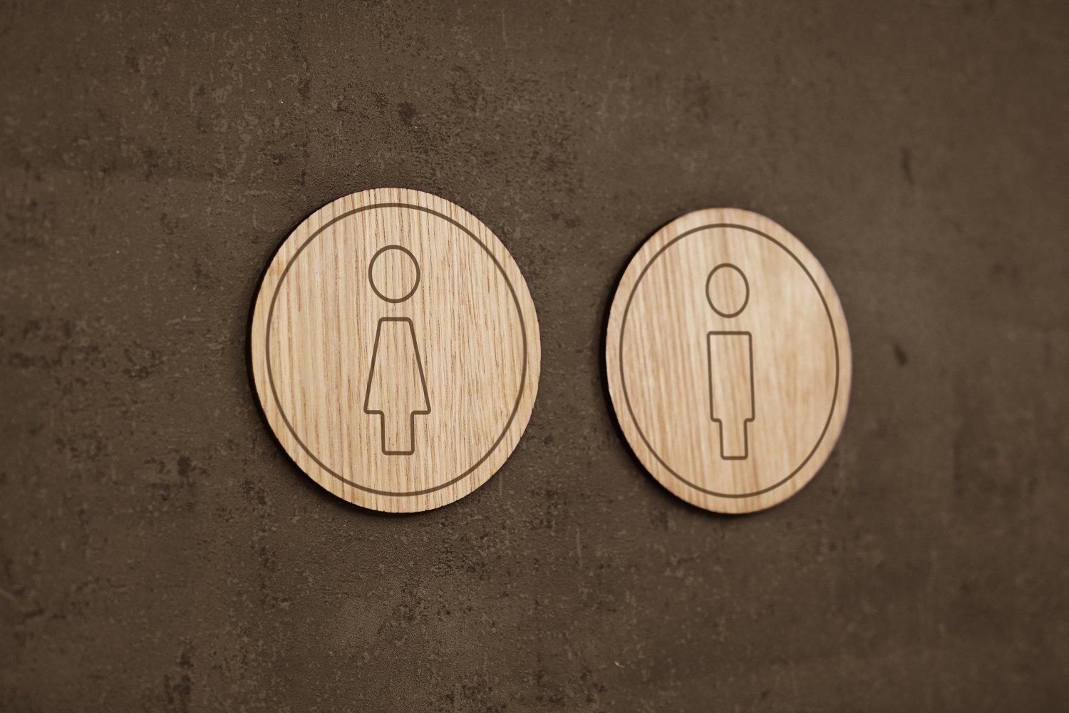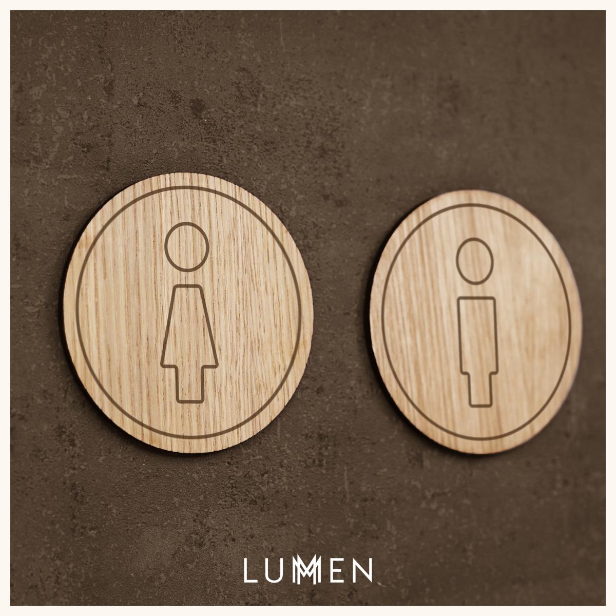 Enkle toiletskilte i træ, lavet i runde former med graverede figurer, der tydeligt markerer toiletterne. Perfekt til hoteller, restauranter, caféer og lignende. Sættes op med dobbeltklæbende tape eller elefantsnot.
