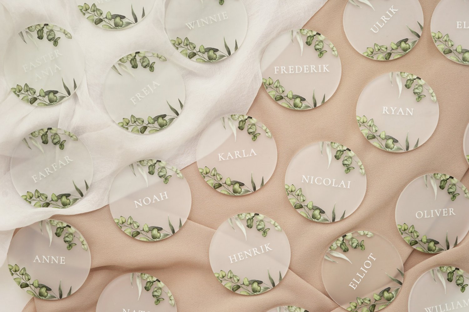 Runde bordkort udskåret i akryl, trykt med gæstenavne og blomster motiv. Bordkortene pynter rigtig fint på tallerkenen, og gæsterne vil elske at de kan beholde deres bordkort som et lille minde fra festen.