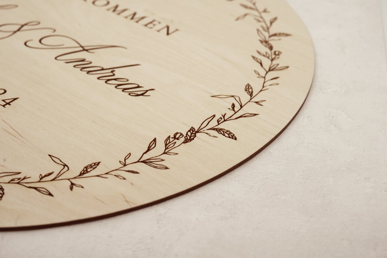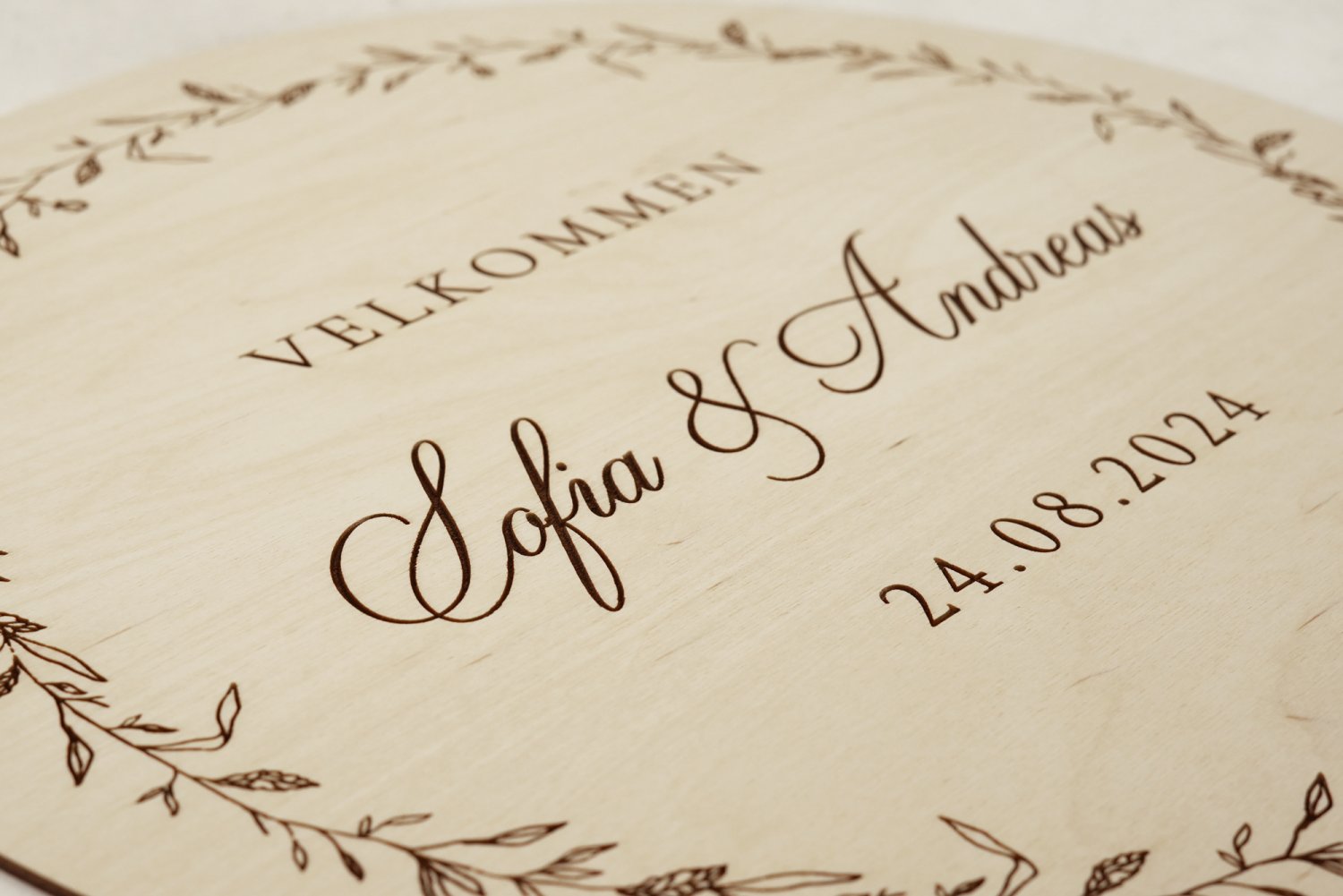 Byd gæsterne velkommen til vielse, reception eller bryllupsfest med et unik velkomstskilt i træ, graveret med personlige informationer og håndlavede illustrationer.