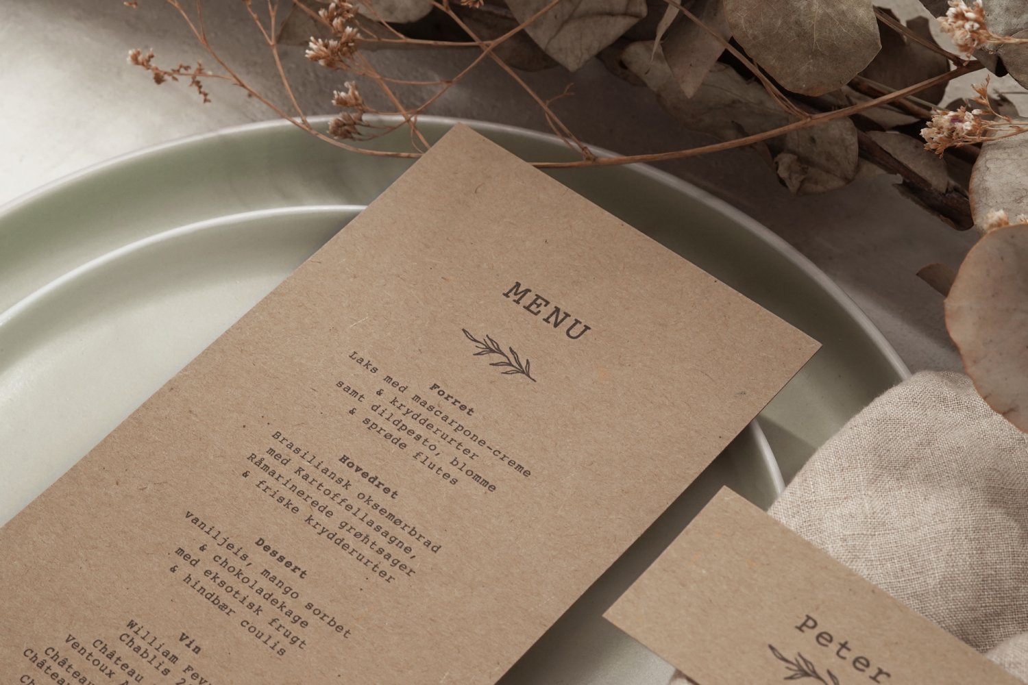 Menukort i rustik stil på natur kvistkarton med blad illustrationer og enkel skrift med personlig menu. Til parret, som ønsker et rustikt og moderne bryllup.