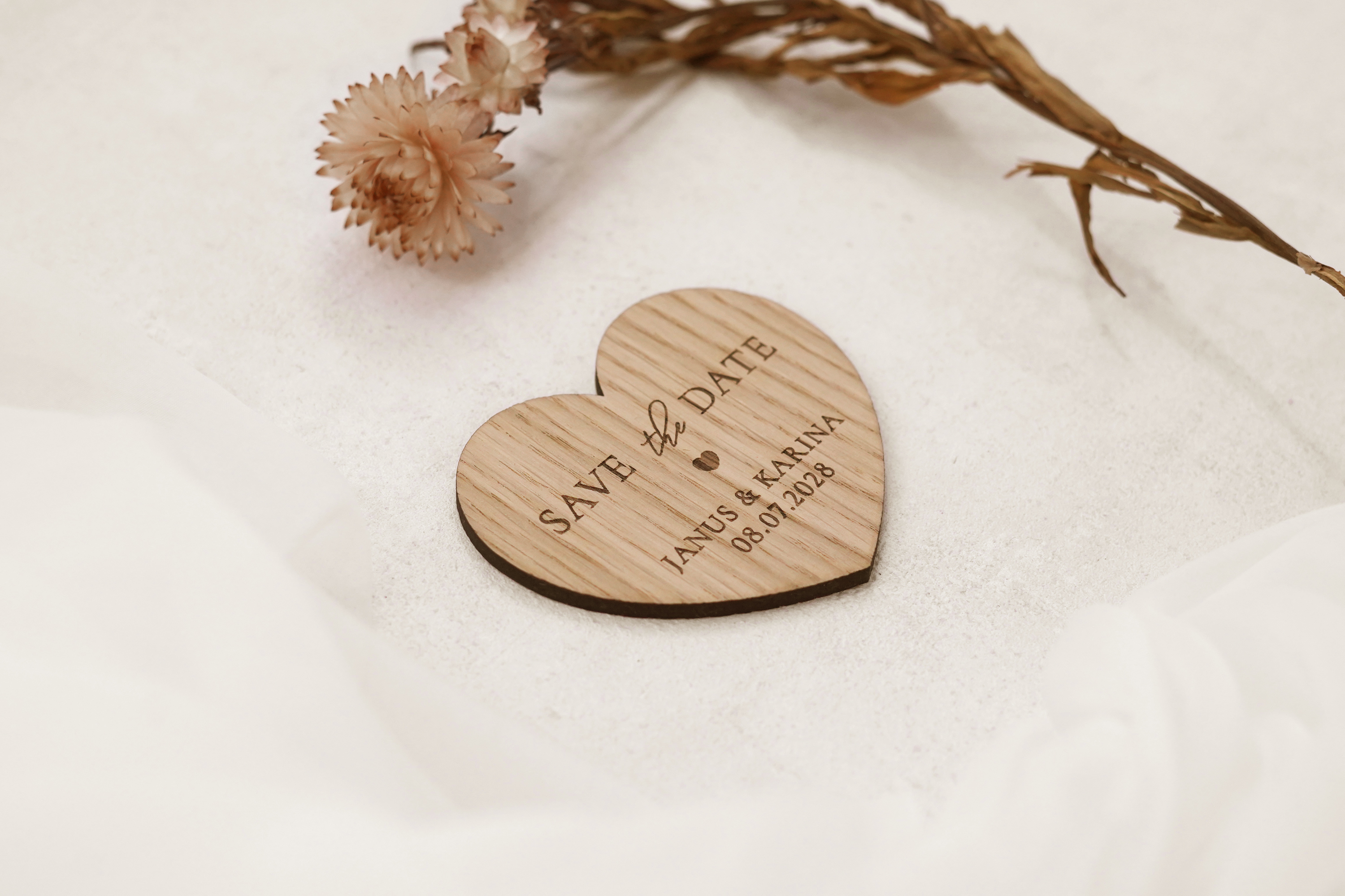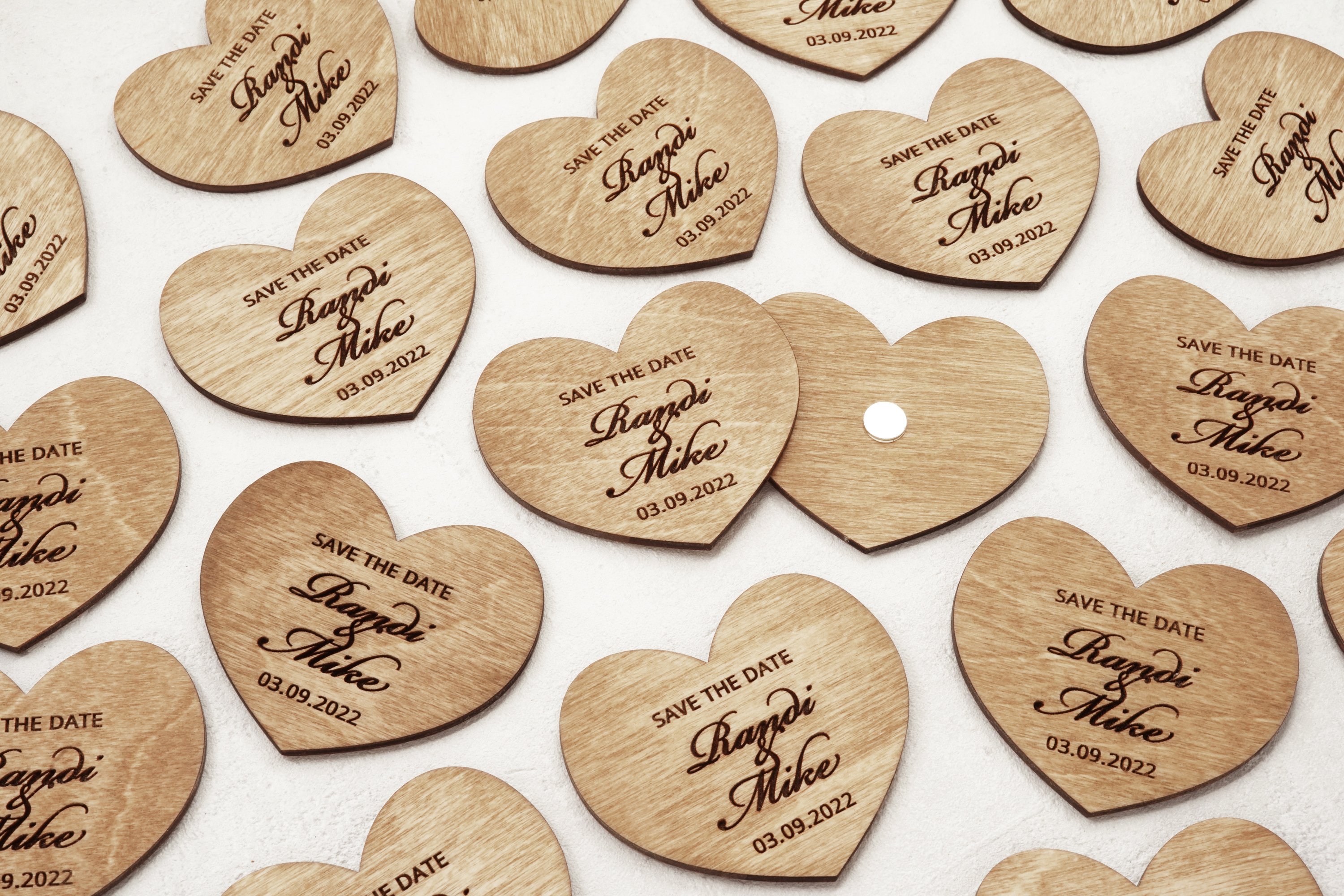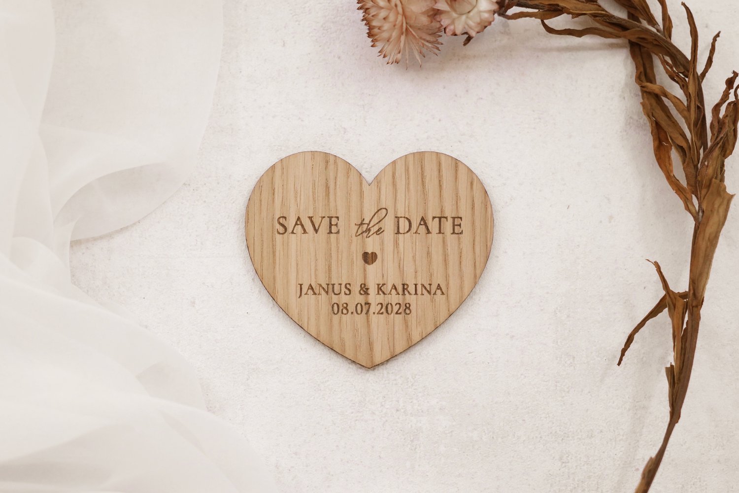 Overrask gæsterne med en Save the Date magnet i træ, som kan sættes på køleskabet, og dagligt minder dem om bryllupsdagen. På forsiden graveres eller trykkes navne og bryllupsdato. På bagsiden sidder en lille, meget stærk magnet, så gør det muligt at sætte den på alle magnetiske overflader.