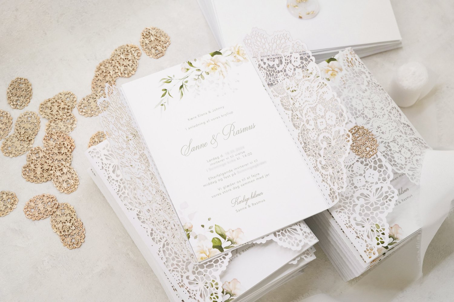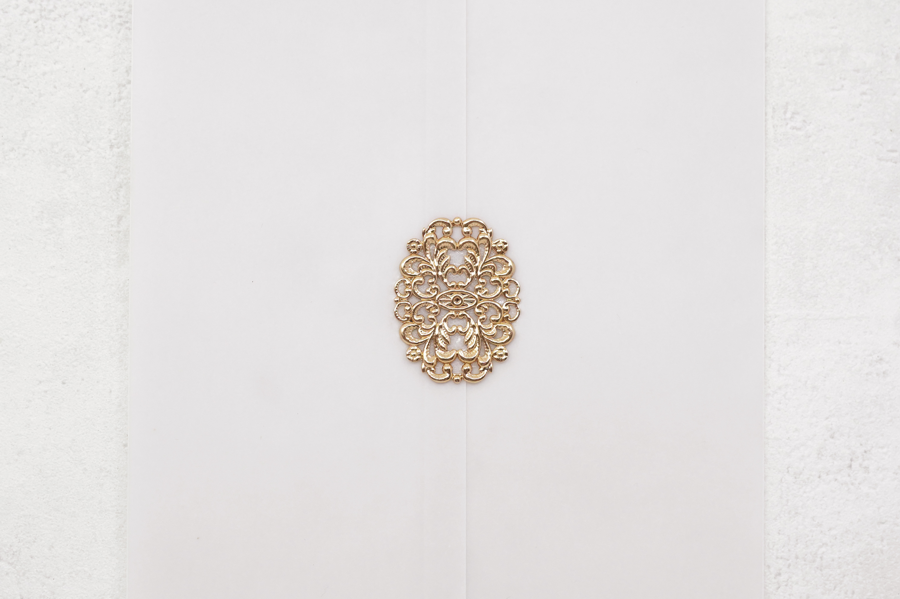 Guld ornamenter med selvskæbende bagside som en ekstra detalje på bryllupsinvitationerne, bordkort og andre kreative dekorationer til brylluppet.