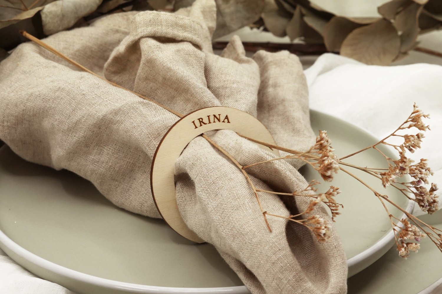 Bordkort udskåret i træ med gæstenavne, som pynter rigtig omkring servietten som en servietring, og gæsterne vil elske at de kan beholde deres bordkort efter festen, og have et evigt minde fra den store dag.