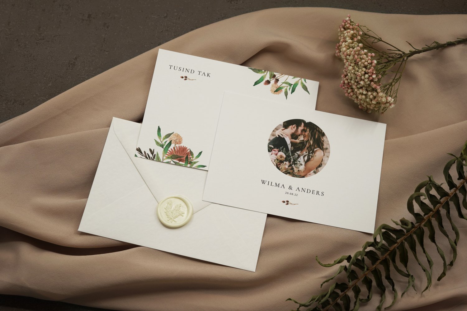 Sienna kollektionen er inspireret af jorden eget pigment, som i oldtiden blev brugt til at tegne botaniske illustrationer, kombineret med en simpel og tidløs skrift. Valgfrit tilbehør, herunder bl.a. kvalitetskarton, det populære vellum omslag, blødt invitationsbånd og konvolutter med adressetryk.
