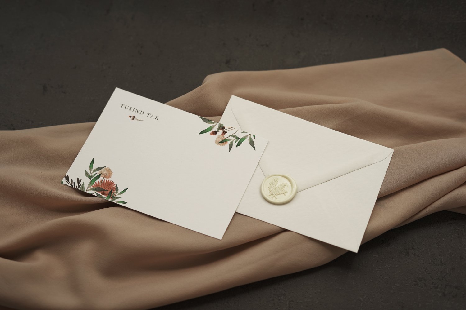 Tak gæsterne for deres deltagelse ved jeres store dag med håndlavede takkekort. På kortene er der trykt "Tusind tak", med plads nede under til at der kan skrives en personlig tekst i hånden til hver gæst. Ønskes en fortrykt tekst, ens på alle ark, sendes teksten i en email.