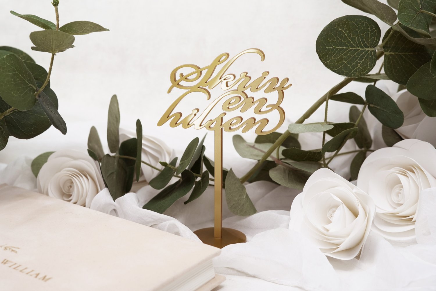 Elegante udskåret gæstebogs skilt med ordene "Skriv en hilsen", som opfordrer gæsterne til at skrive brudeparret en lille hilsen i gæstebogen på bryllupsdagen. Vælg mellem en masse forskellige farver fra listen.