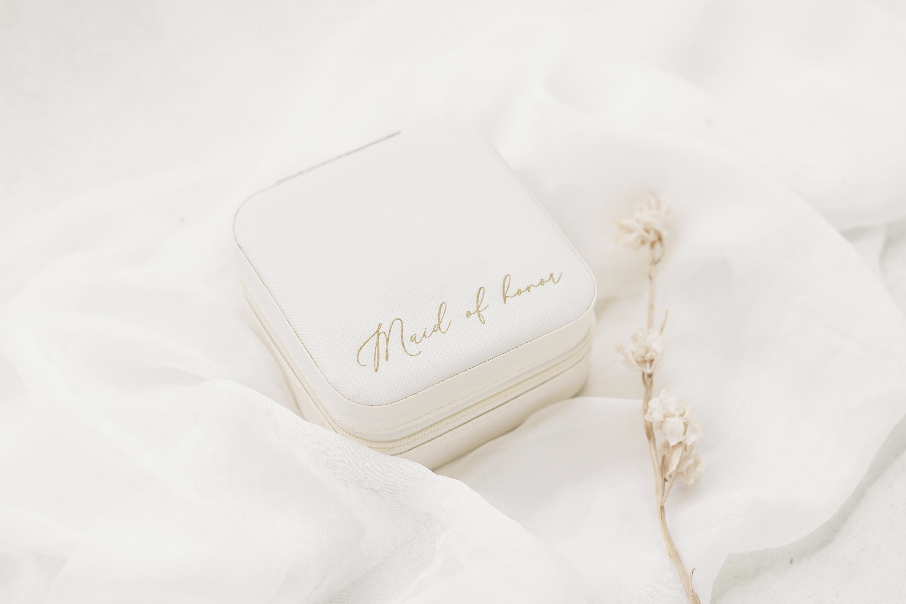 Elegant smykkeæske i lys cremefarvet kunstlæder, graveret med navn for et personligt præg. Perfekt til opbevaring af ringe, øreringe og halskæder – en smuk og tidløs æske.
