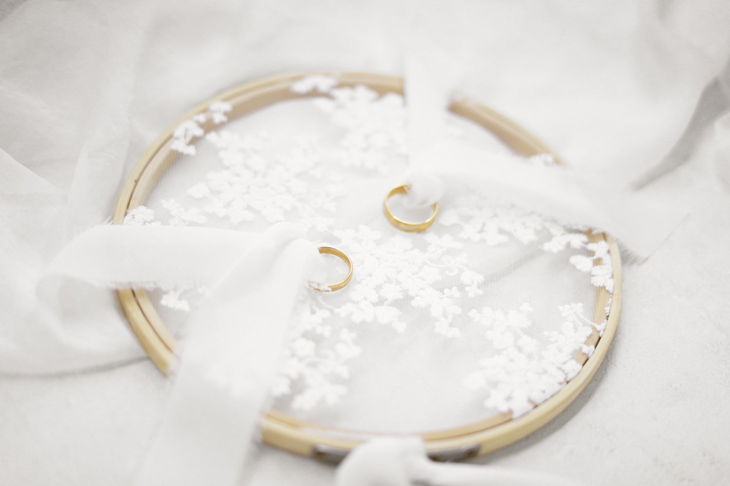 Elegant rund håndlavet ringholder til vielsesringe under ceremonien. Holderen fremstilles af birketræ med hvidt broderet blomster stof, pyntet med håndlavet silkebånd til at binde ringene fast på. En smuk detalje til enhver bryllupsceremoni.