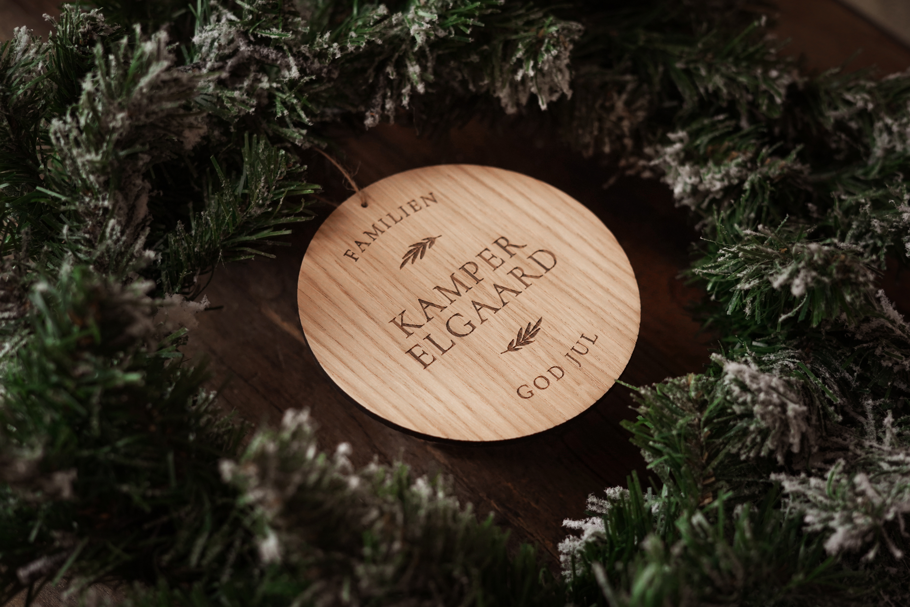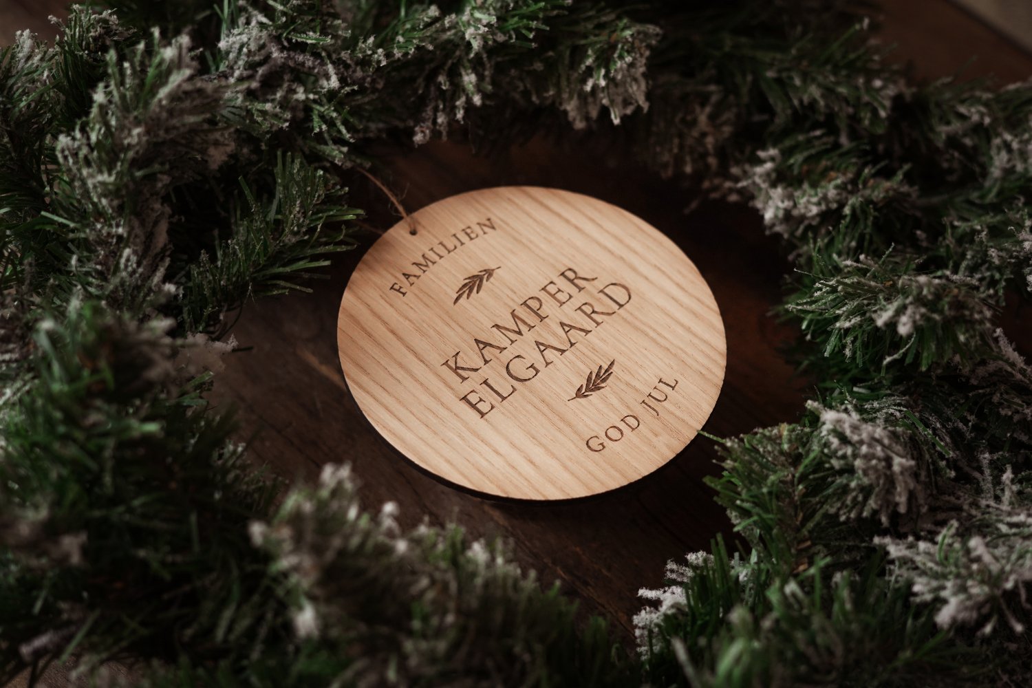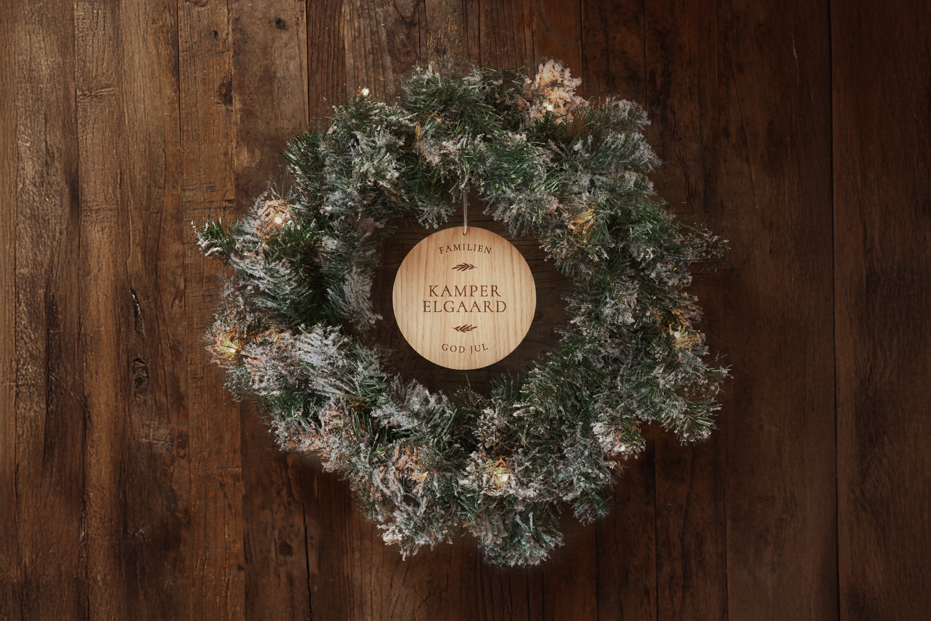 Stor, unik julekrans med indbyggede lys og et rundt skilt i midten, trykt med personlig tekst. Kransen er smukt dekoreret med sneeffekt, hvilket skaber en elegant og festlig stemning til jul. Kransen har LED-lys, som er batteridrævet med en timer af 24 timers interval.