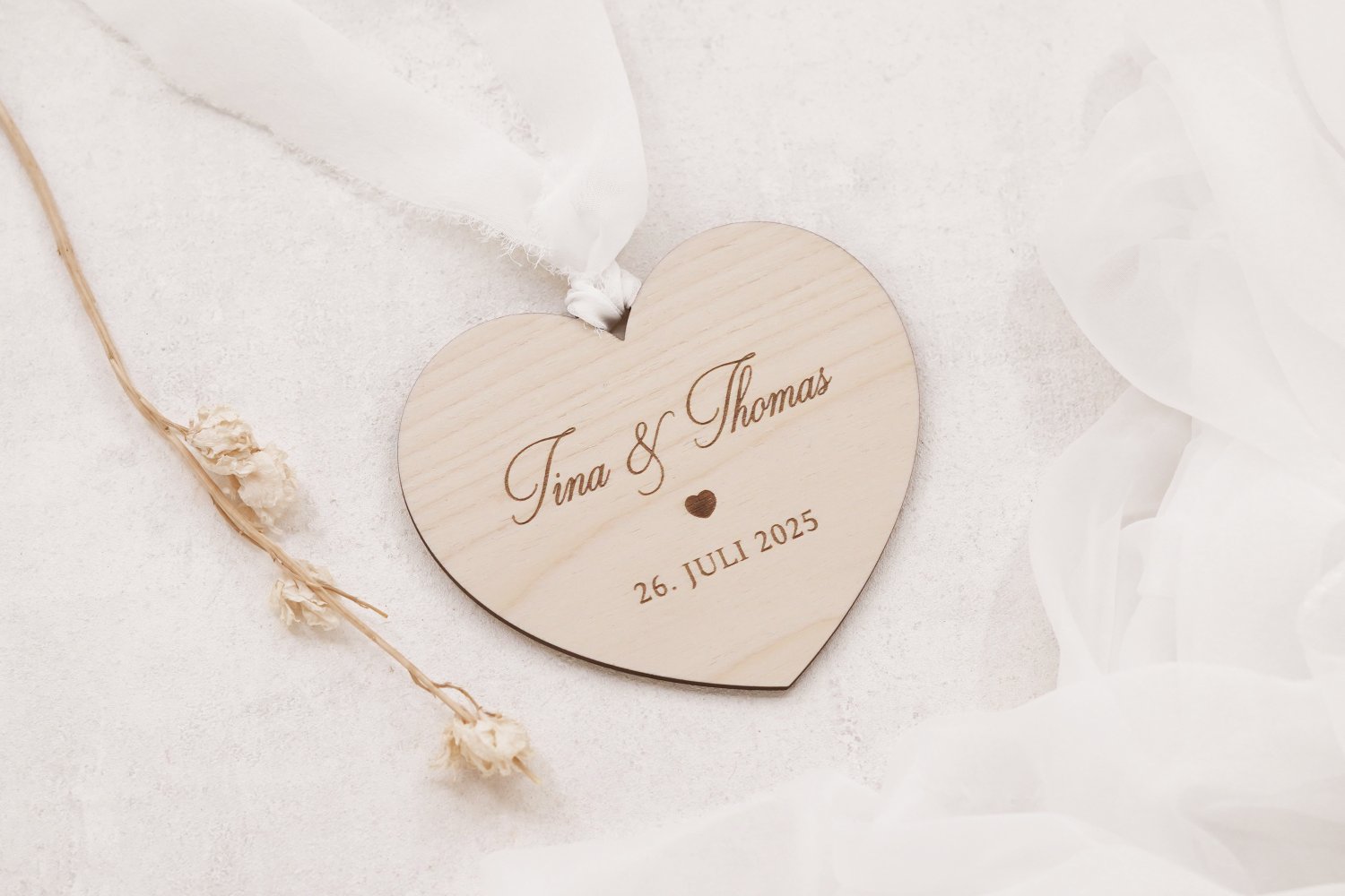 Smukt mindehjerte i træ, graveret med brudeparrets navne, bryllupsdato og evt. monogram. Et personligt minde fra den store dag, som kan hænges op i hjemmet som en smuk dekoration.
