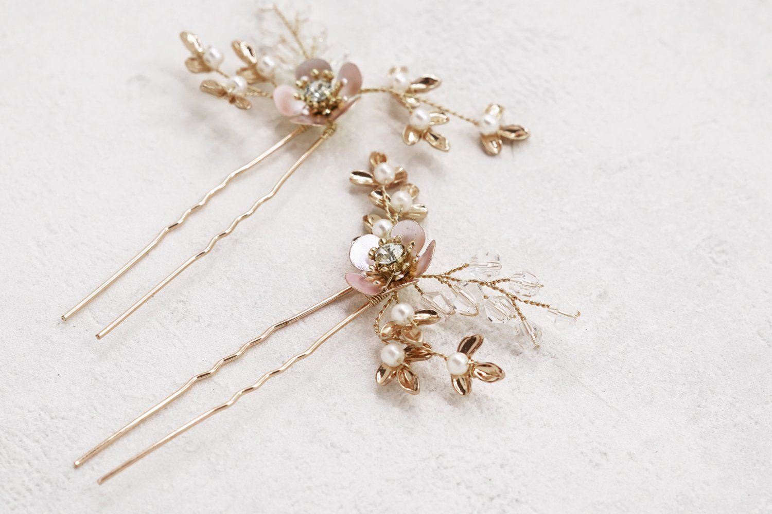 Hårnåle til bruden i efterårets toner fra Paris med gyldne blade med hvide perler, klare perler og brunlig blomst i midten.