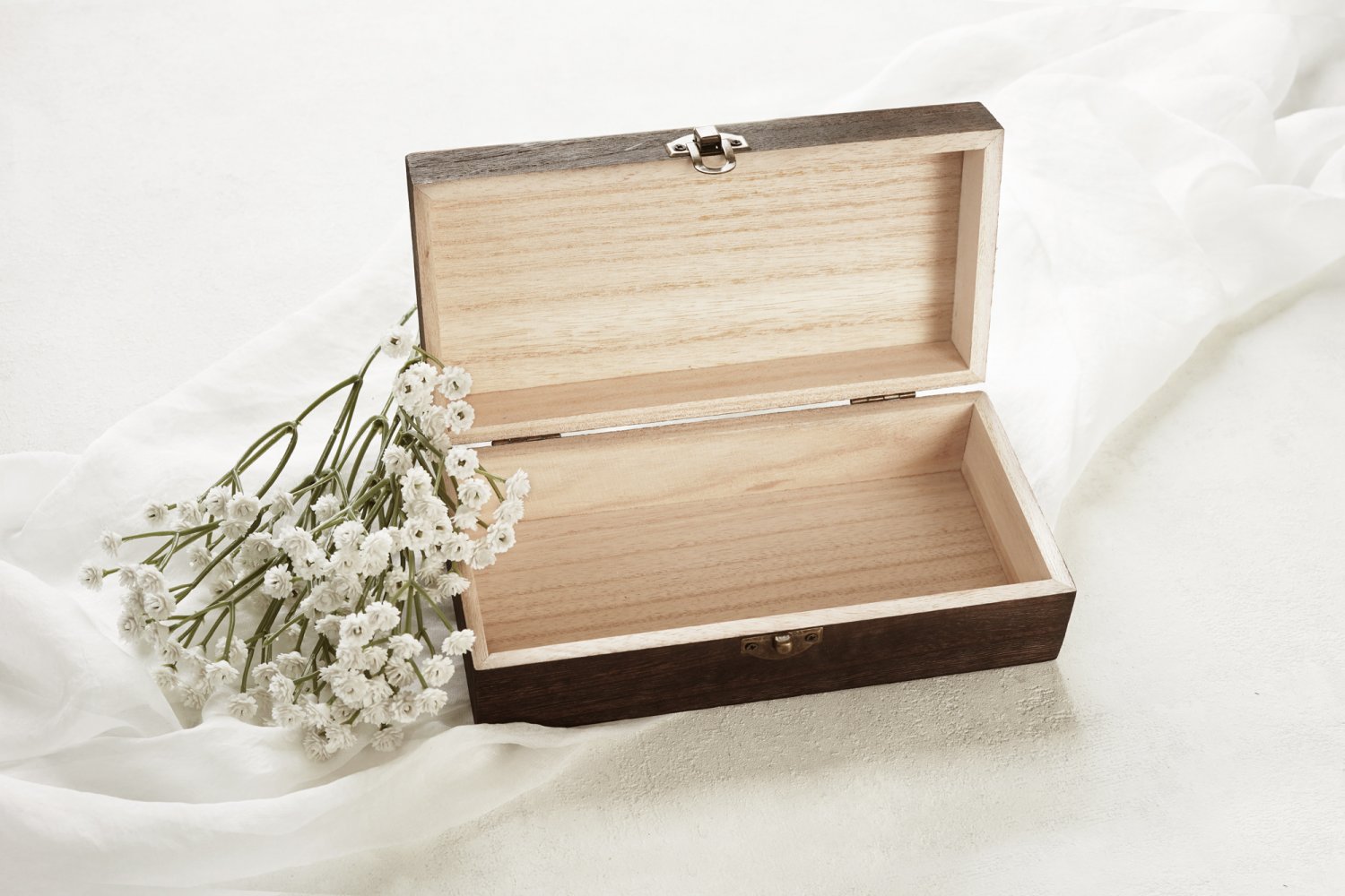 Personliggjort trææske med fødselsinformationer til de bedste minder, foto eller som en sød gaveidé. Æske fremstilles af olieret wengetræ med låg og lås og ovenpå udskæres det udvalgt navne i birketræ.