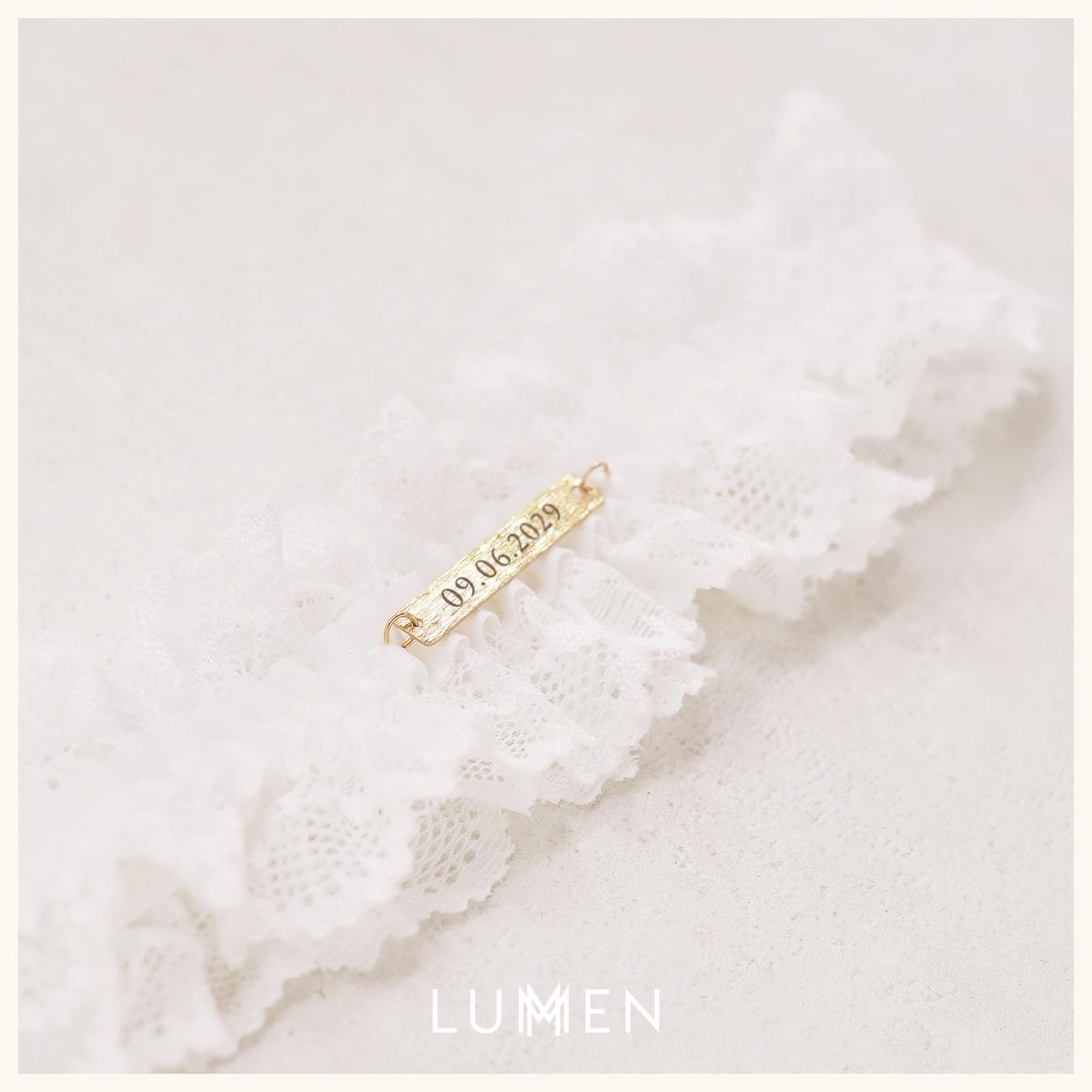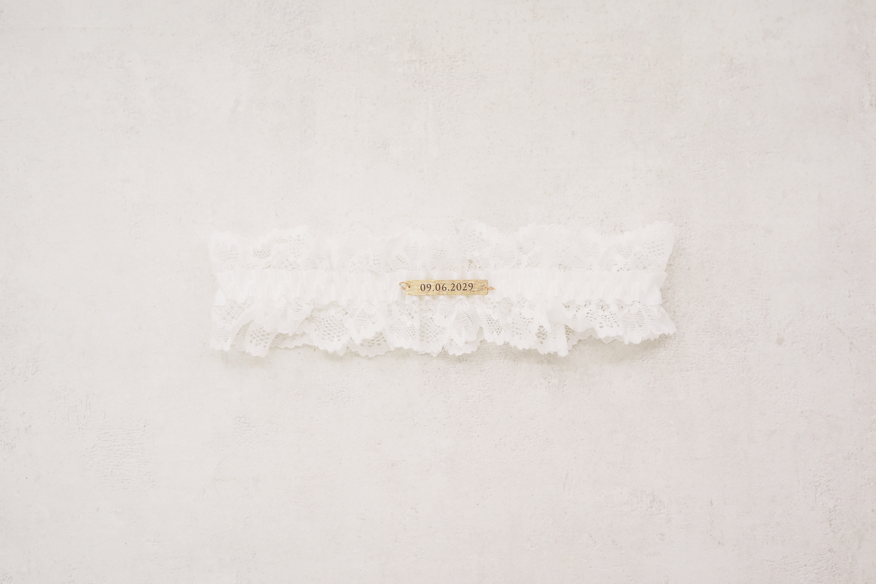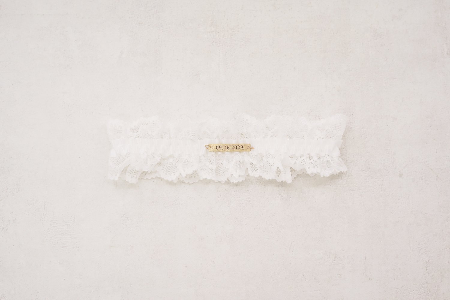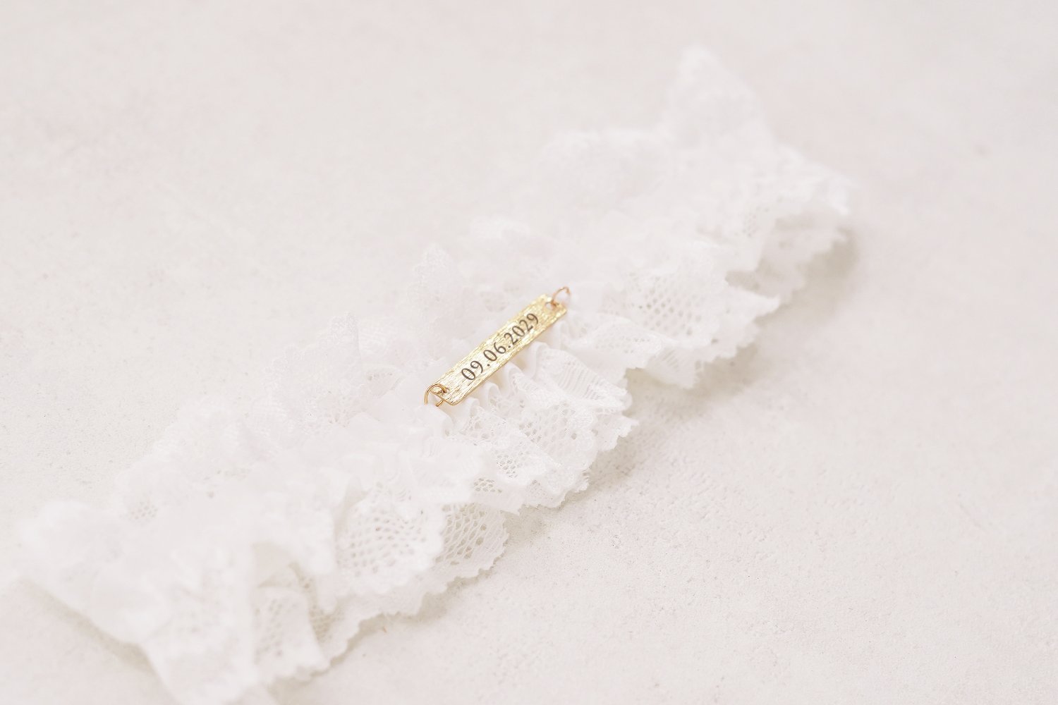 Unikt blonde-strømpebånd til bruden med elegant gyldent vedhæng, graveret med bryllupsdato. Det fine blondedesign giver et romantisk udtryk, mens den personlige gravering gør det til et særligt minde fra den store dag.