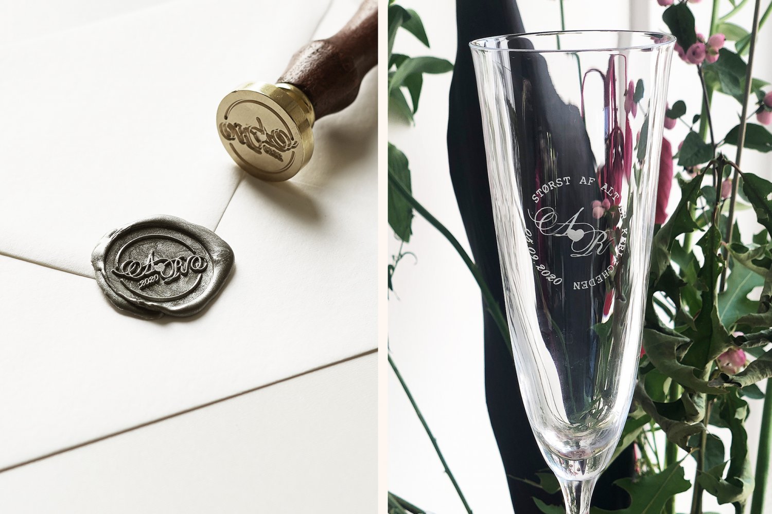 Få designet jeres monogram regntegnet af LUMEN, så det kan bruges på alle produkter til bryllupet, herunder alle tryksager, såsom bryllupsinvitationerne, lakseglstempelet, menukortene og hvor I ellers måtte ønske det.