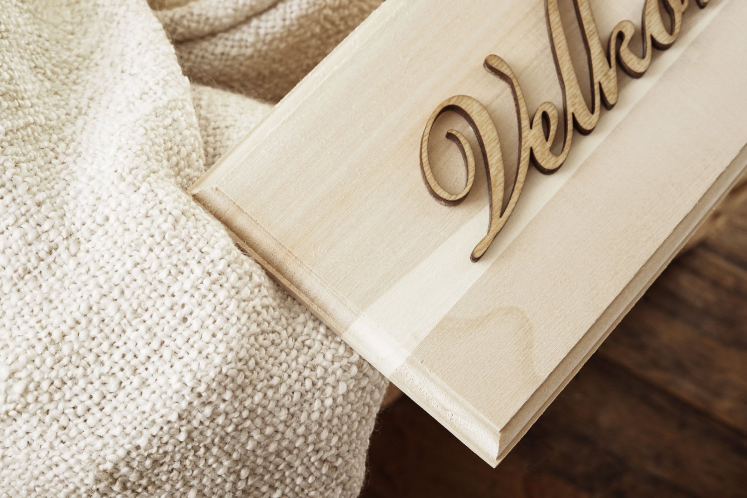 Lad dine besøgende føle sig velkomne i dit hjem med et hyggeligt velkommen skilt med kalligrafiskrift. Skiltet håndlaves af træ og derfor er hvert skilt unikt i finishen. Skiltet kan nemt hænges op på væg eller dør, via hullet på bagsiden.