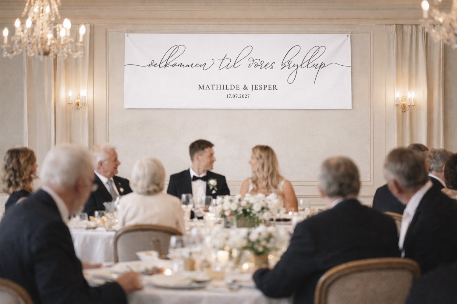 Et velkomstbanner i stoflærred med smuk kalligrafiskrift og din egen personlige tekst – perfekt til at byde gæster velkommen med elegance og personlighed. Ideelt til bryllupper, festlige begivenheder eller særlige anledninger.