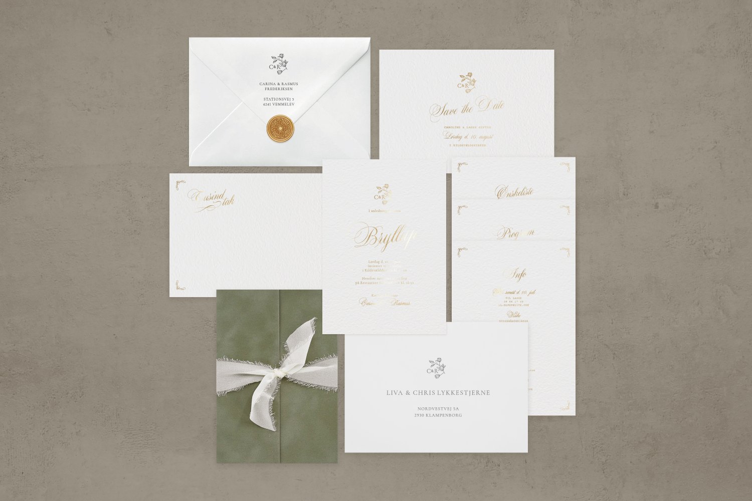 Venus kollektionen forener vintage charme og moderne elegance ved at fremhæve brudeparrets navne med kalligrafiskrift i valgfri farve, ledsaget af enkle små detaljer. Et tidløst design, der fanger essensen af romantik.